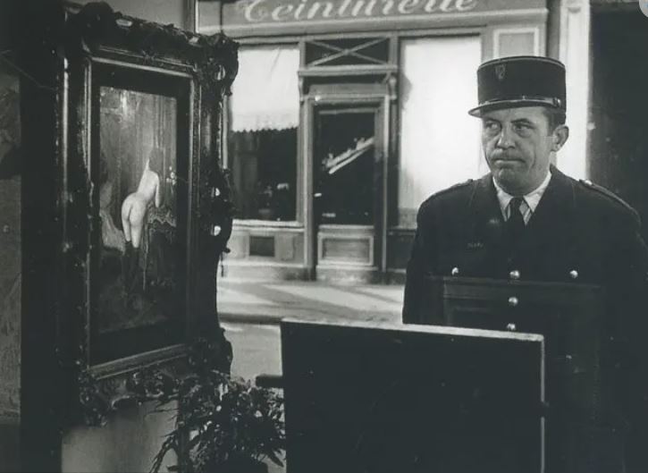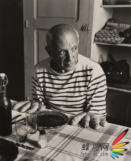 1952年,此时毕加索正在以法国为根据地奋力创作。有一天,杜瓦诺扛着相机去拜访他,约见地点是位于尼斯山后的伯特利村中的一个小咖啡厅。时值早餐时间,面包师端上两个条面包,每个面包又分成4条小面包。或许是毕加索的主意,他将两个面包放在胸前的桌上,分列于盘子两侧,乍一看就像一双将要抄起餐刀而少了拇指的巨手。毕加索还摆出一个面朝窗外的姿态,颇为传神。杜瓦诺当然不会让这个有趣的情景从镜头前溜走,于是拍摄了这幅照片。