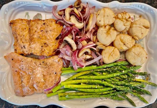 老公说他想吃海鲜盘,没问题,去韩国超市买全了干贝,三文鱼,洋葱炒磨菇,单爆芦笋,花啦!海鲜盘成形了!