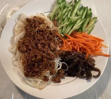 女儿说她想吃炸酱面,那更简单了,黄瓜,胡罗卜,黑木耳切丝,手拉面煮好,加上早就做好的炸酱肉末,一搅拌,花啦!北京炸酱面就让女儿高兴地大叫 : "好妈妈,真会变魔术啊!“