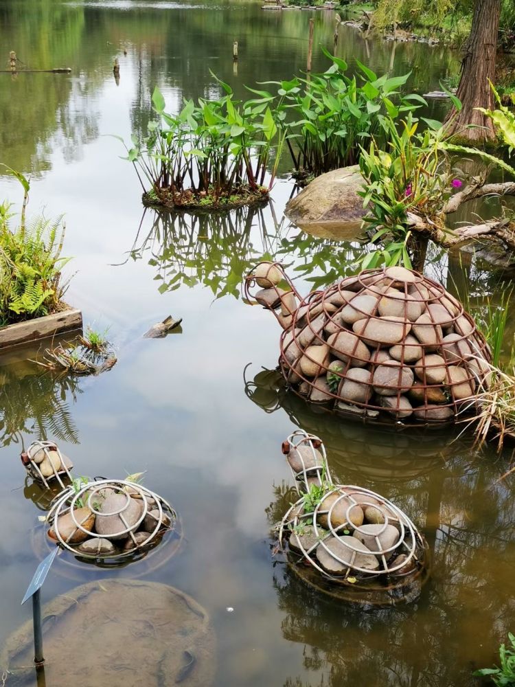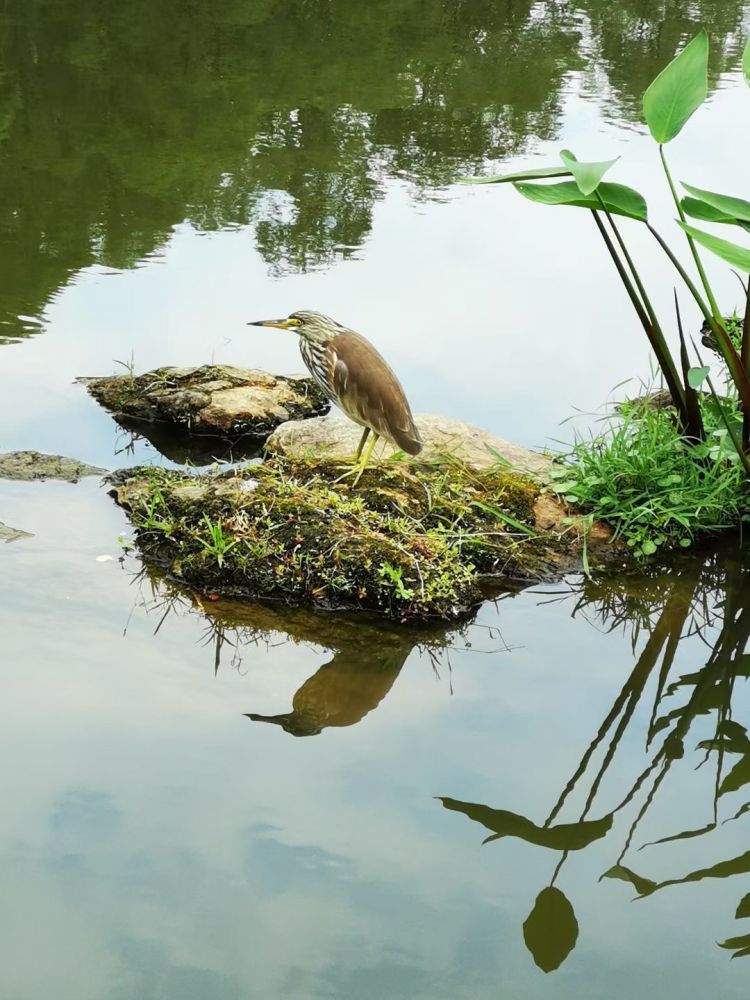 沿湖有桫椤树杉树等不知名的茂盛林木,和不知名的花花草草环绕。湖光山色,清雅幽静, 池鹭和白鹭低翔,划出灵动的流线,诗情画意。置身其中,如入桃花源。
