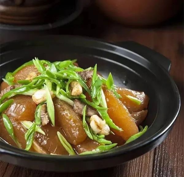 3.临出菜时,在热锅里放猪油,先下大蒜粒和青尖椒节炒香,再下煨好的萝卜块炒匀,起锅装砂煲里便可上桌。