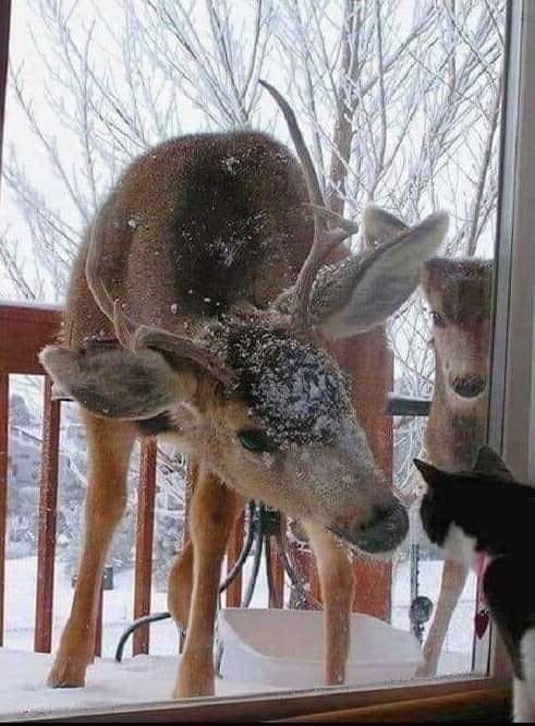 每冬一雪,每日一白, 隔着玻璃我们相望的眼波。 里暖外寒,传递爱香, 鹿天天来探,隔门猫怀里的春天。