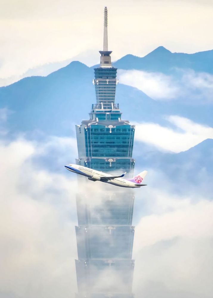 台北著名的101大厦,飞机在云层中看它,更为高耸伟大!