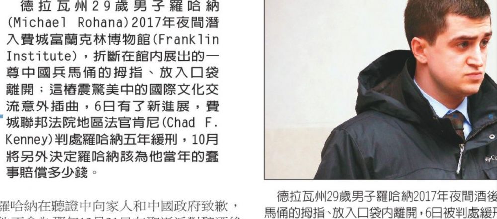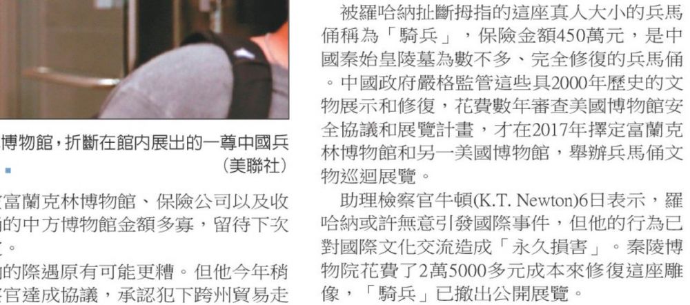 2017年,又出了个“博物馆贼”,他偷的是兵马俑的一根姆指头,更是怪异。不相信谁会花大价钱跟他买这根千年的指头。纯粹是个人爱好私藏,结果被判了5年缓刑,今年10月将再判他得赔多少钱给这家博物馆?这案子走了很长的路,才被法院判决!大概是因新冠病毒把这案子遗忘了吧!