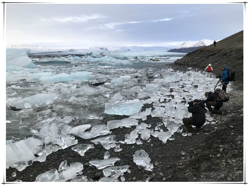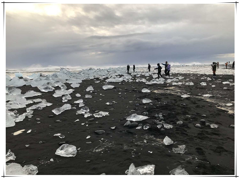 我们离开冰岛南部沿东海岸北上去杰古沙龙冰河湖和钻石沙滩游览。冰河湖是由冰川融化的水汇聚而成的,随着一直在消融的冰川和不断累积的碎冰,冰河湖的面积越来越大,冰水交融的景色也越来越美。在冰河湖的对面大西洋岸边,黑色的沙滩上搁浅着无数大大小小的冰块,远远地看去就好像是无数闪闪发光的钻石,钻石沙滩也因此得名。我们在此停留了很长时间,我拍了很多照片,发到朋友圈里给质疑我的微友们展示一下什么是冰岛的冰。