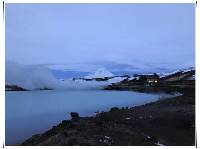 一潭带有地热的湖水和一个亮着温暖灯光的人家