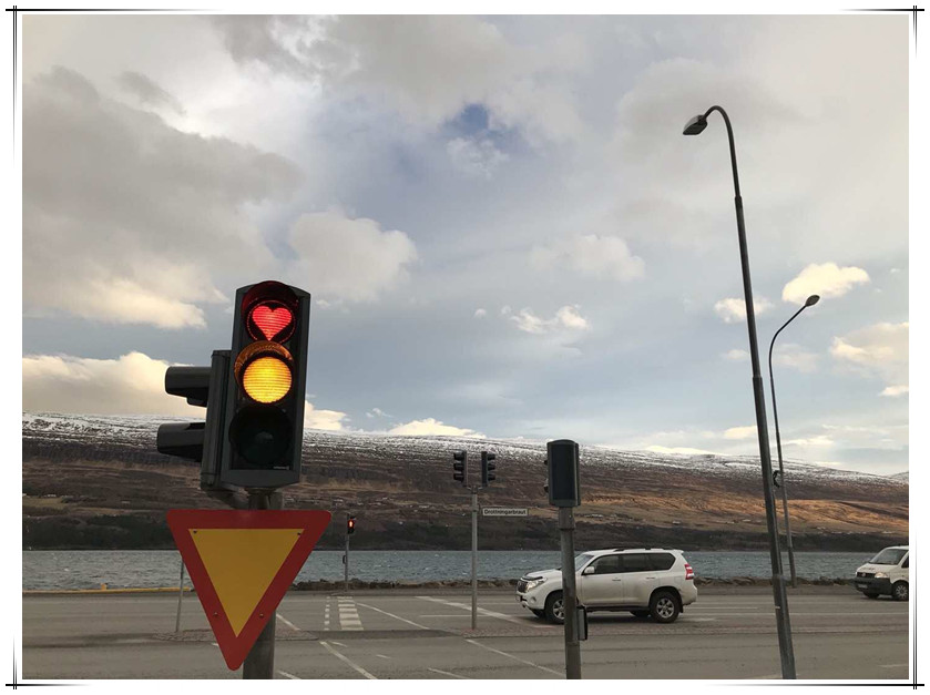 阿克雷里最具特色的城市亮点还是红色心形的交通信号灯,据说2008年的金融危机给整个冰岛蒙上了一层阴影,为了帮助市民重拾信心,阿克雷里发起了一个“用心微笑”的全民运动,鼓励市民用积极的态度对待生活,一时间这座童话小城变成了一个红心的海洋,人们在房子外墙、车窗、书包上贴上大大小小的红心,当地商户全部换成红心名片,学校为孩子们提供的饼干也做成心形,隔海相望的峡湾的山坡上出现了巨大的心形照明灯,城市的交通信号灯的红灯也由圆形变成了心形,并且一直延续至今。