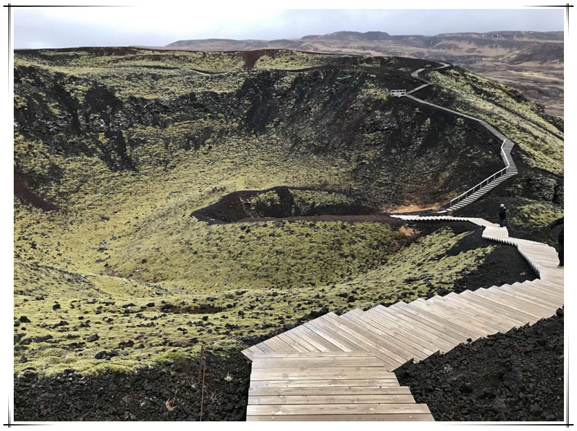 冰岛被人们称之为“冰与火的岛屿”,冰是指冰川,火是指火山,冰岛有两百多座火山,其中四十多座活火山,冰岛最近一次火山爆发是在2010年,那场火山爆发威力巨大致使冰川融化引发洪水,造成当地800多人疏散,大量的火山灰弥漫在欧洲大陆的上空,造成整个欧洲航空系统瘫痪。我们一路走来也看见不少火山,但只是远远地相望,不知它们的名字,也不知道它们是死是活,更不知道它们真实的样子。在环岛的最后一天能登上一座火山也算是给我们这次环岛游画上了一个完满的句号。沿着弯弯曲曲的小路我们登上了火山顶,看着火山喷发后留下的巨大的火山坑,想象着它当年喷发时的雄威不由得感叹大自然的力量以及人类的渺小。由于火山口周围观景的路很窄,山顶的风又很大,又没有围栏,恐高的心理加上担心被大风吹下山谷的恐惧使我低下身姿小心谨慎地绕火山坑一圈,匆匆拍了几张照片就赶紧下山了。