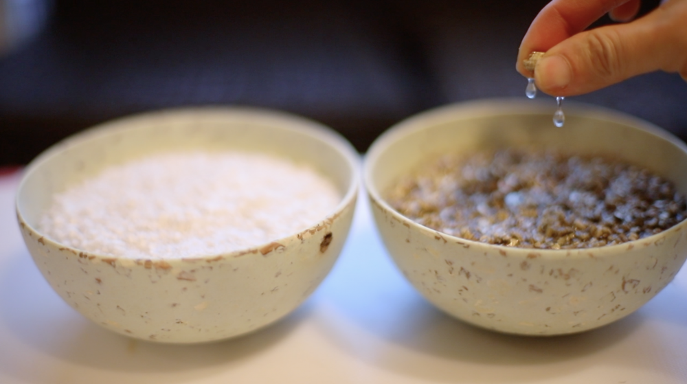 给它们添加水的时候,可以看到,它们的体积基本没有改变,水分都被吸收了,只在过饱和时它们才漂浮起来。所以它们都有保水性,只是珍珠岩是在表面吸附水分,水分会由于重力流逝;而蛭石是将水分锁在中间,所以非常保水。