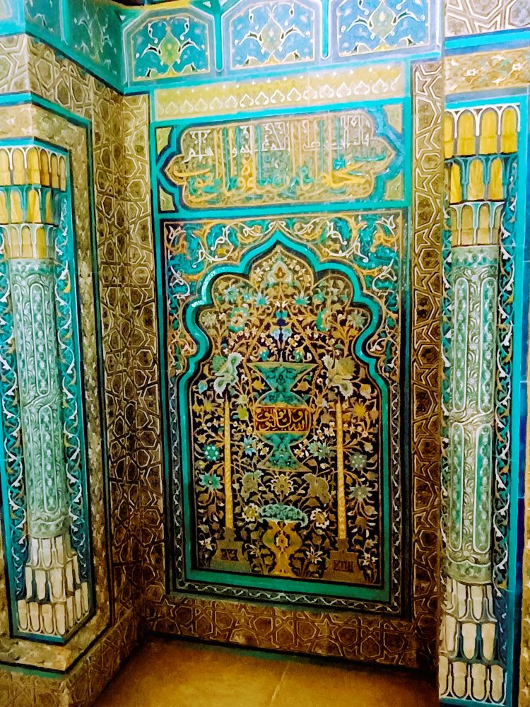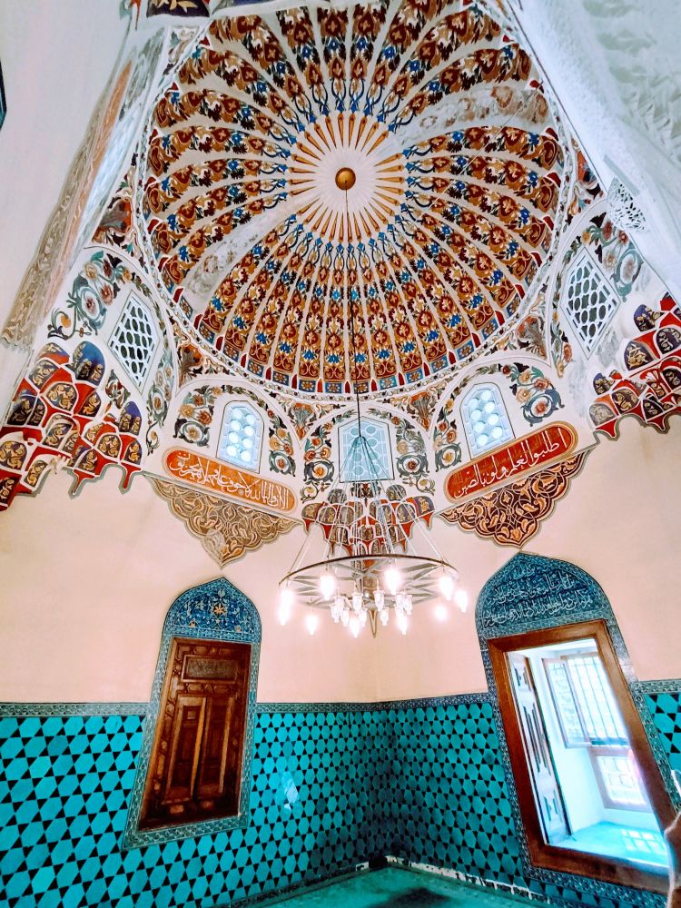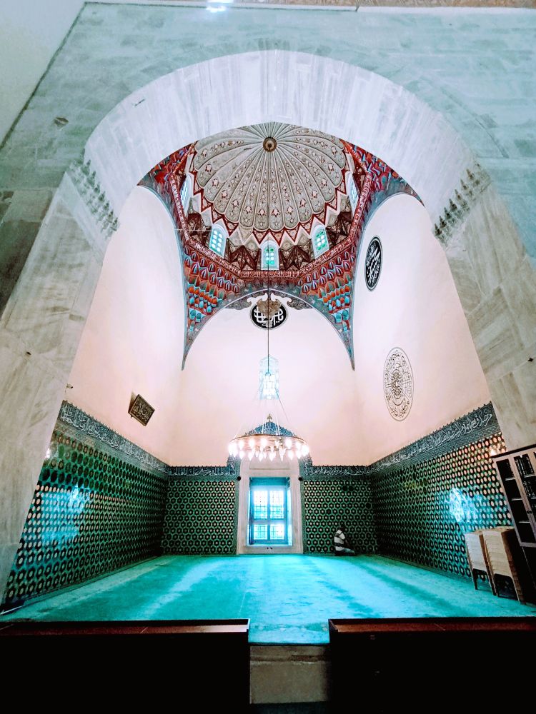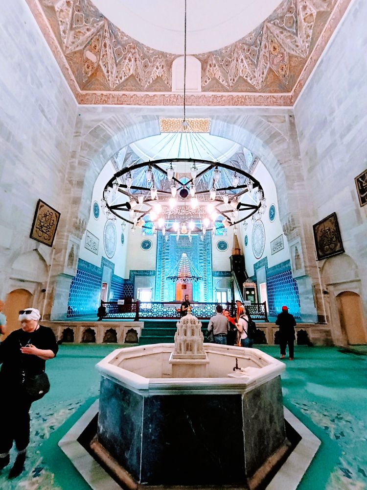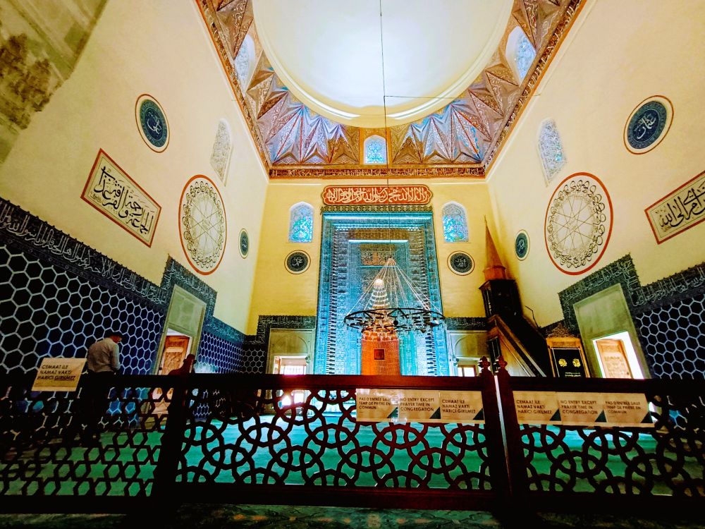 这座清真寺是奥斯曼帝国早期建筑的代表作之一,建于1419年。最引人注目的是其内部装饰:墙面和穹顶覆盖着精美的蓝绿色瓷砖,几何图案与阿拉伯书法交织,营造出如梦似幻的视觉体验。(见下图)