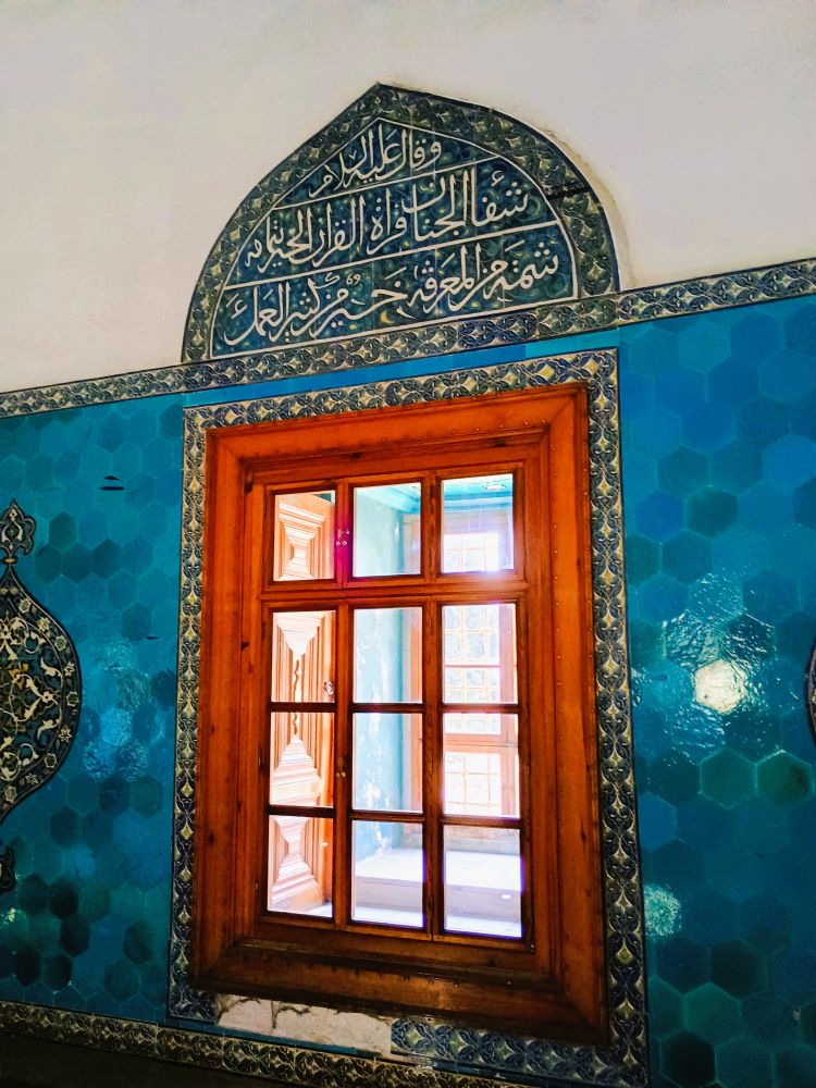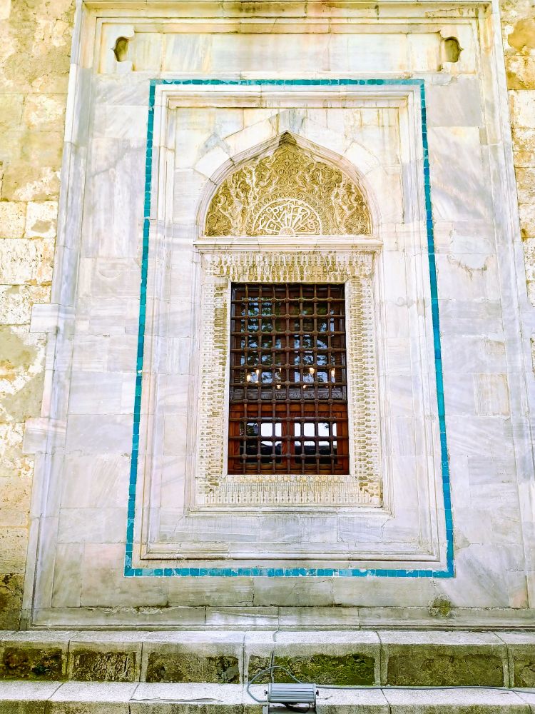 绿色陵墓建于1421年,是奥斯曼帝国第五位苏丹穆罕默德一世的安息地。(苏丹这个称呼来自伊斯兰教,意思是帝国的最高统治者,相当于国王和君主的地位)。之所以叫绿色陵墓是因为内部装饰均为蓝绿色瓷砖,阳光照耀下呈现出绿松石光泽。陵墓中央是穆罕默德一世的石棺,周围有几具其他家族成员的石棺。出于习惯(和迷信),我一般不拍摄石棺陵墓,但是内部装饰的颜色相当迷人,于是破例拍了内部的墙和窗户,瓷砖的美丽可见一斑。(见下图)