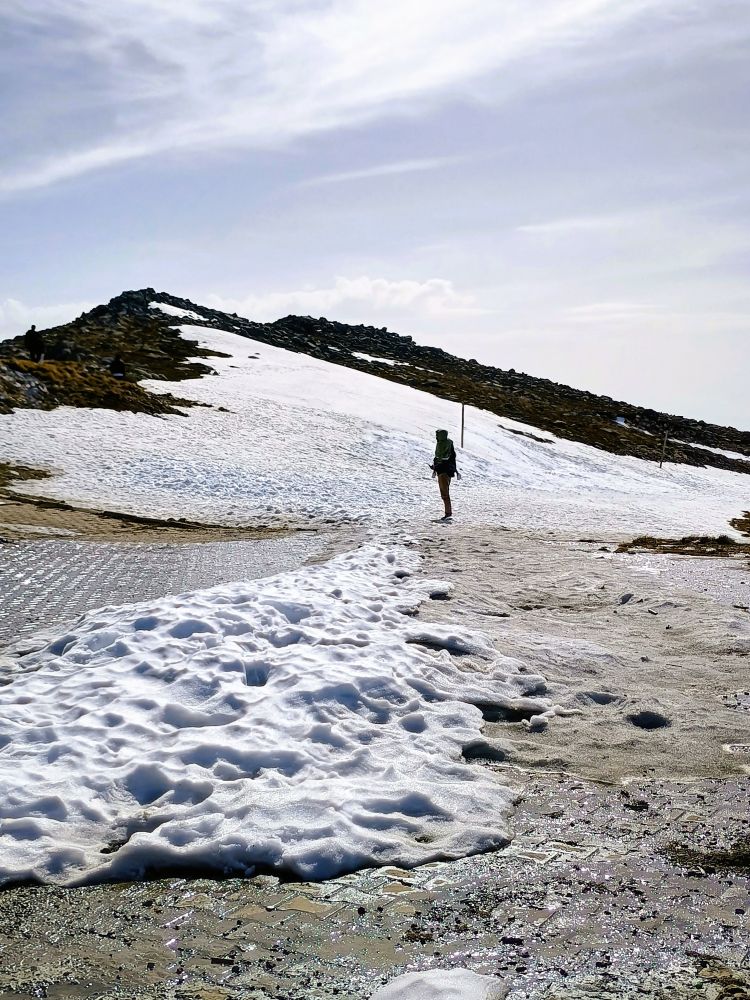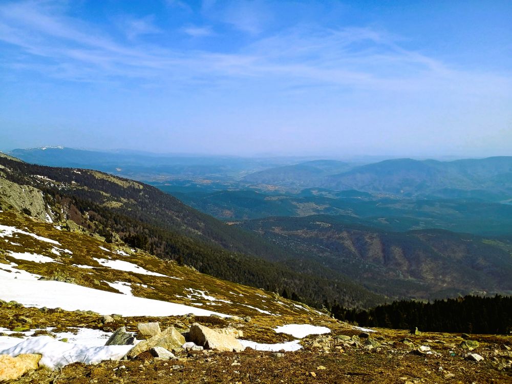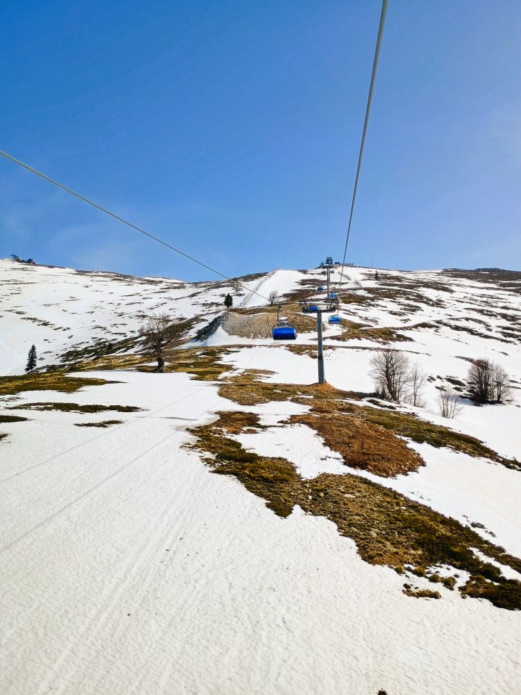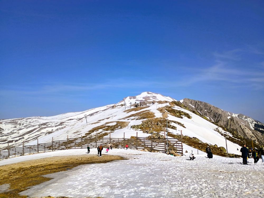 缆车终点站可以望到乌鲁达山脉更高的山峰,虽然已是四月底,依旧白雪皑皑。我们又乘坐一家私营公司的滑雪缆车,上了山顶,踩着白雪观赏了四周的风景。