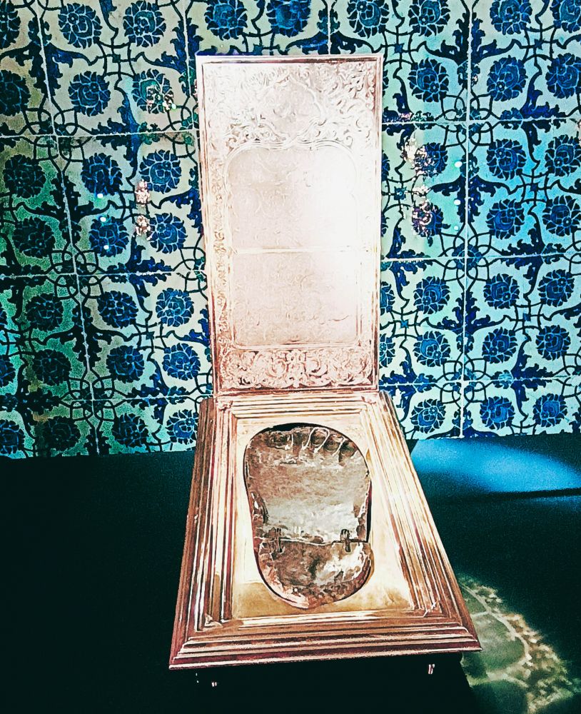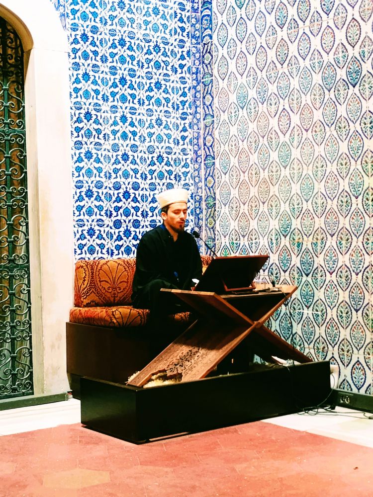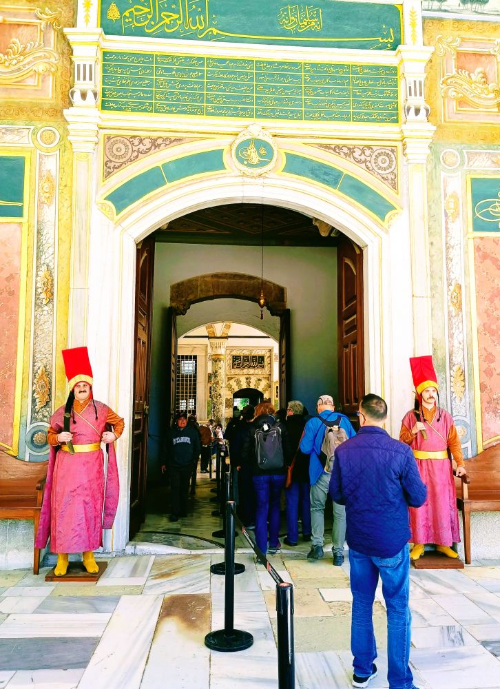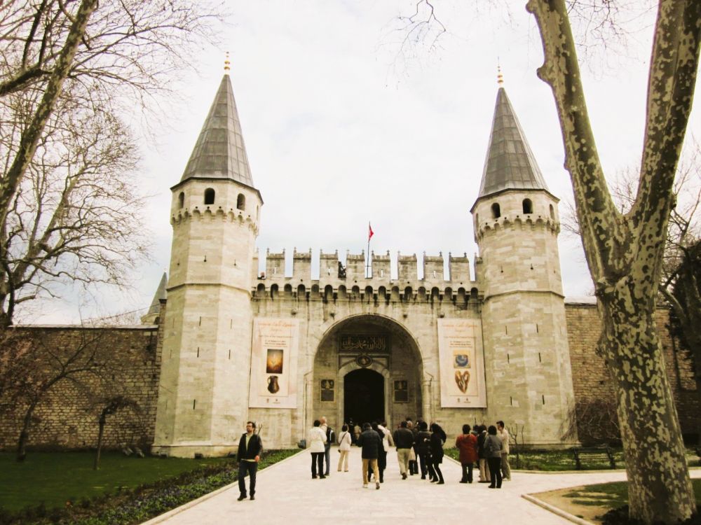 3. 托普卡帕宫:建于1459年,是奥斯曼帝国最具代表性的皇宫,地理位置极佳,俯瞰金角湾和博斯普鲁斯海峡。直到19世纪中叶,这座宫殿曾是奥斯曼苏丹的主要官邸。如今,托普卡帕宫成为博物馆,收藏了各种文物,如瓷器、武器、珠宝、服饰、伊斯兰书法等。在一个宫殿中,耳濡目染了宣教师的诵经。下图中的头两张摄于2011年,那时进出宫殿无需安检,刚进门正好遇到一队帅兵。之后照片的顺序是:宫殿入口的卫兵、宫殿阳台、阳台外的景色、穆罕穆德的脚印、诵经的宣教师、宫殿中的图书馆。