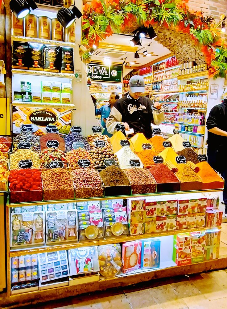 4. 香料市场(Misir Carsisi),建于1663年,是土耳其第二大室内集市(第一大是大巴扎),也是世界上最大的香料市场。这里出售各种香料和土特产(如土耳其软糖、果干、果仁、橄榄、花茶等),空气中弥漫着各种香料的气味。由于伊斯坦布尔是丝绸之路的最后一站,香料市场出售从东方(亚洲)运来的香料,曾是欧洲人寻找、憧憬东方浪漫之地。下图是香料市场内外。