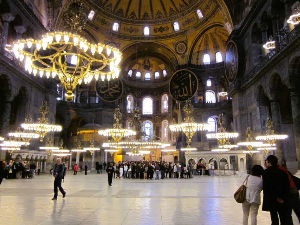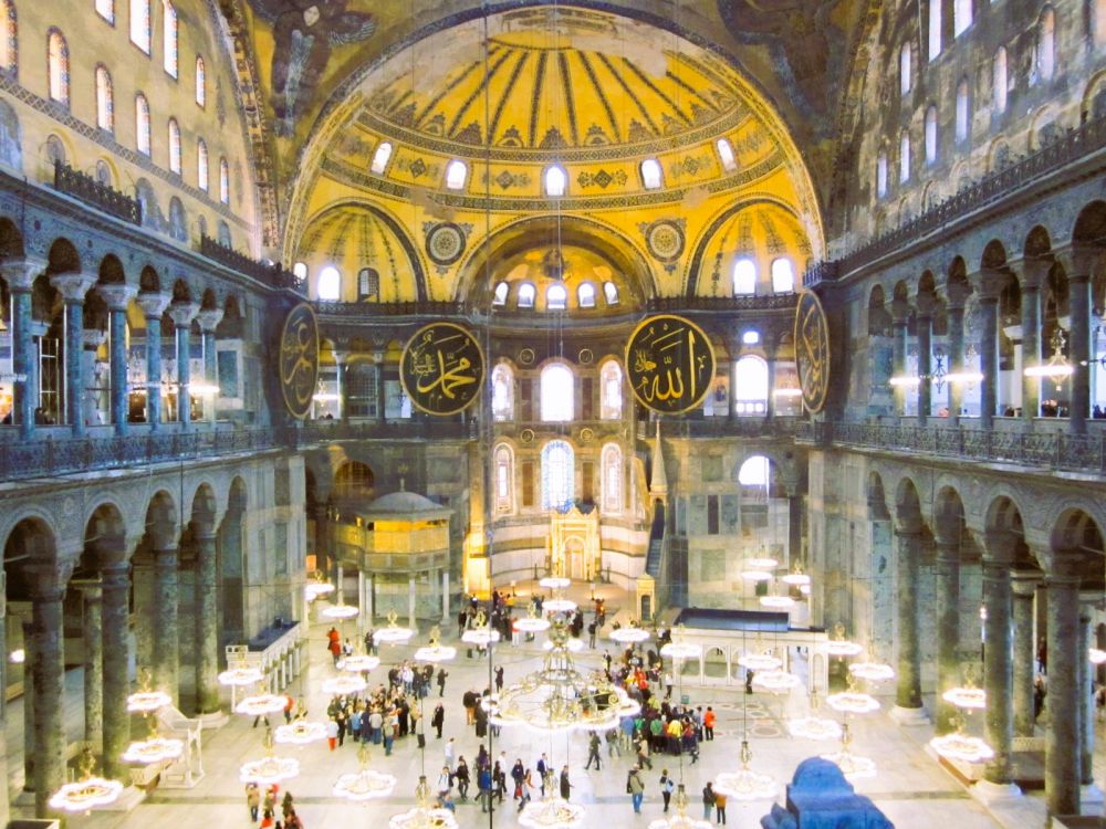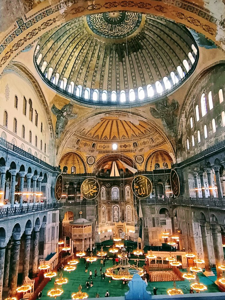 1. 圣索菲亚大教堂有近1500年历史,最初是拜占庭皇帝查士丁尼一世于公元537年下令建造的东正教主教堂。这座建筑以其巨大的圆顶闻名于世,直径超过30米,高达55米,是拜占庭建筑的巅峰之作。一度曾被改为清真寺,后又成为博物馆,如今恢复为清真寺。它的马赛克壁画尤其著名。