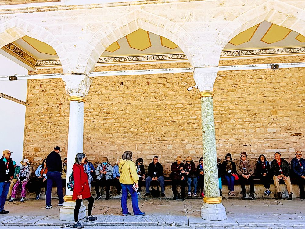 旅行团在伊斯坦布尔只安排了一天的参观活动,从早到晚,马不停蹄去了圣索菲亚大教堂、蓝色清真寺、托普卡帕宫、香料市场,外带蓝色清真寺前面的苏丹艾哈迈德广场和附近的商业区。可想而知,一天安排这么多活动,无非就是去打卡。特别是在托普卡帕宫,导游(穿黄衣)滔滔不绝讲了一小时,把每个展馆的文物介绍一番(见下图),我们都听累了,最后只留给我们一小时参观时间。不知导游是怎么想的,游客都希望亲眼看看实体文物,而非只听抽象介绍。之后在其他景点,导游也是非常来劲地解说,实际观赏时间相当紧促,这恐怕是跟团游非常普遍的一大短处吧。
