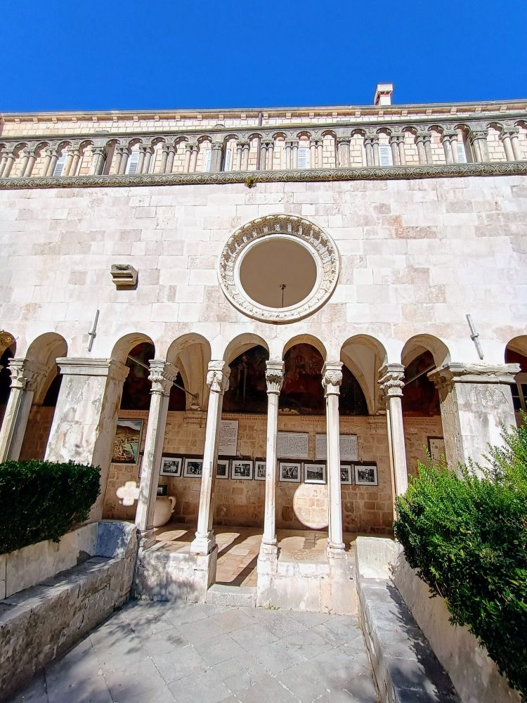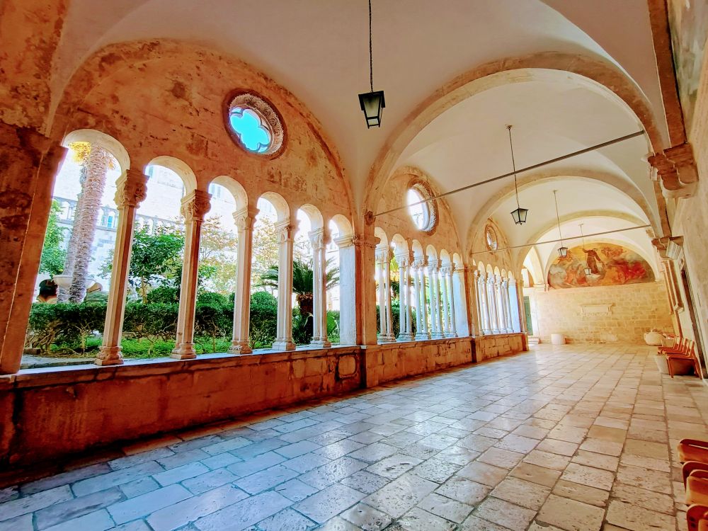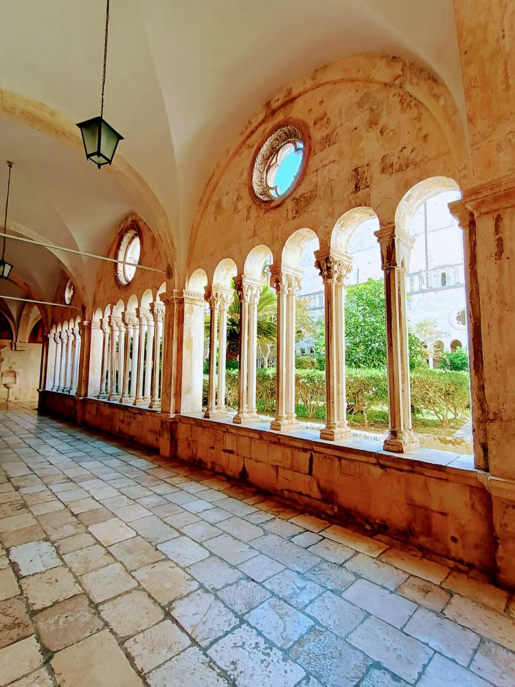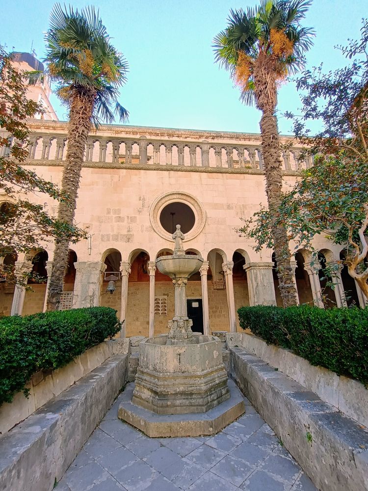 下图为大喷水池旁边的方济各教堂与修道院(Franciscan Church and Monastery),建于1317年,是杜城最古老的宗教建筑之一。图1是教堂祭坛。修道院回廊是哥特式风格,雕刻精美。这里拥有欧洲最古老的药房之一,并收藏了大量宗教文物与古籍。