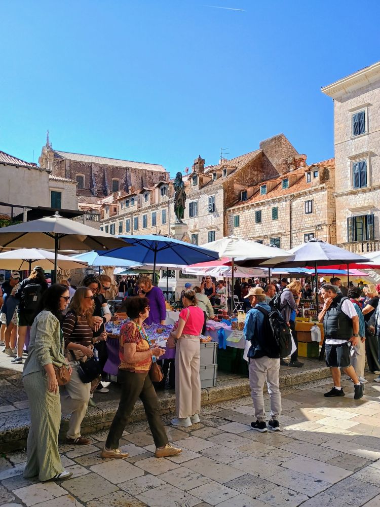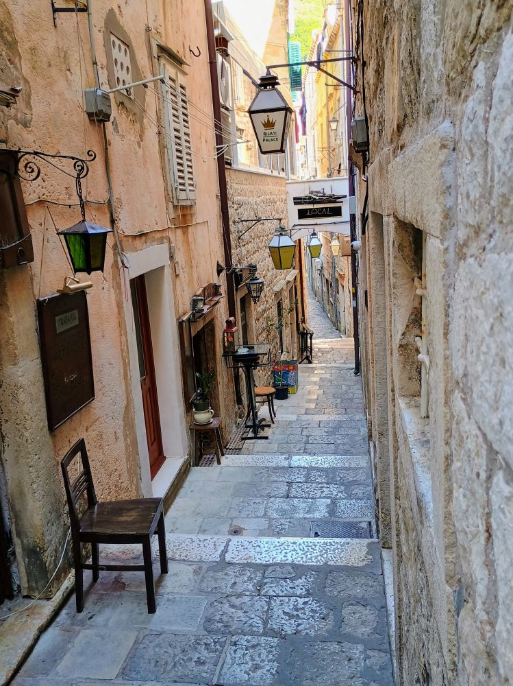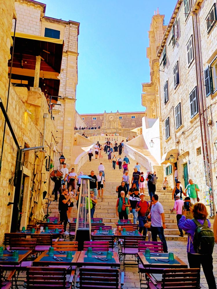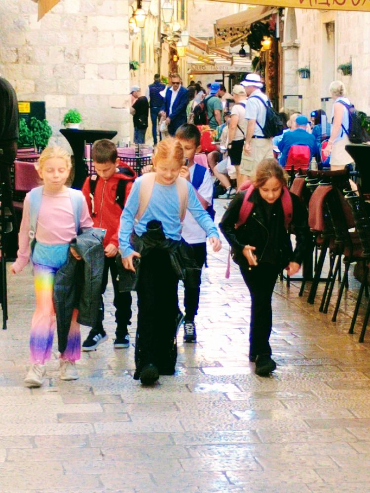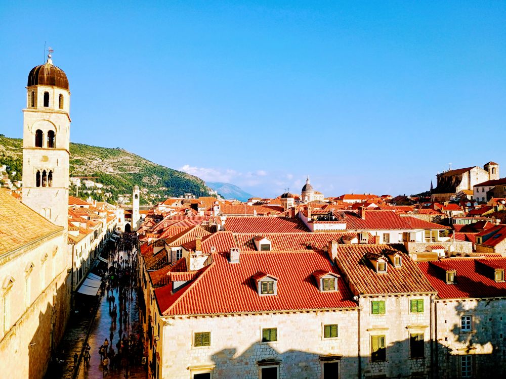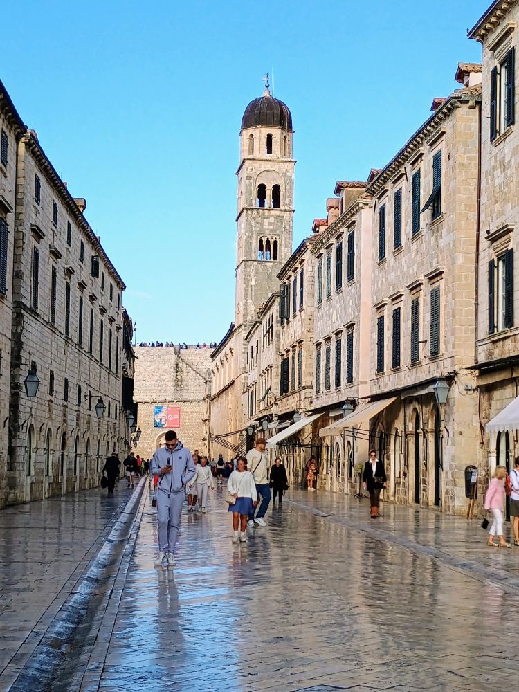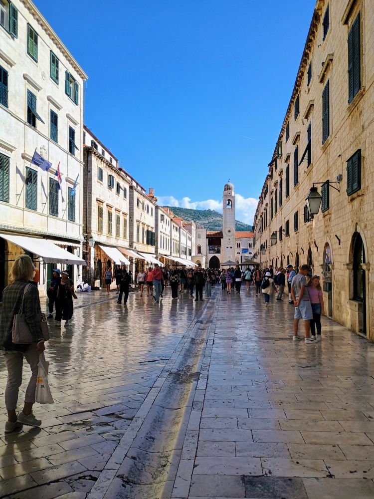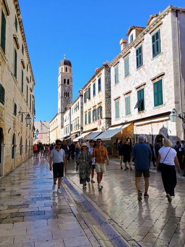 我们汇入了老城斯特拉顿大街(Stradun) 上的滚滚人流。斯特拉顿大街全长约 300米,贯穿老城。从东边老码头附近的卢扎广场 (Luza Square)一直延伸到西边的皮勒城门(Pile Gate)。