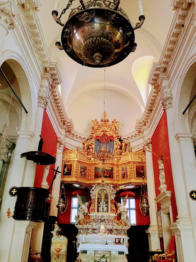 我们还去参观了圣布雷瑟教堂(Church of St. Blaise),建于1715年,巴洛克风格,是杜城守护神圣布雷瑟的主教堂,教堂正面顶部雕像即为圣布雷瑟。教堂内部装饰华丽,祭坛为金色雕刻(见下图)。