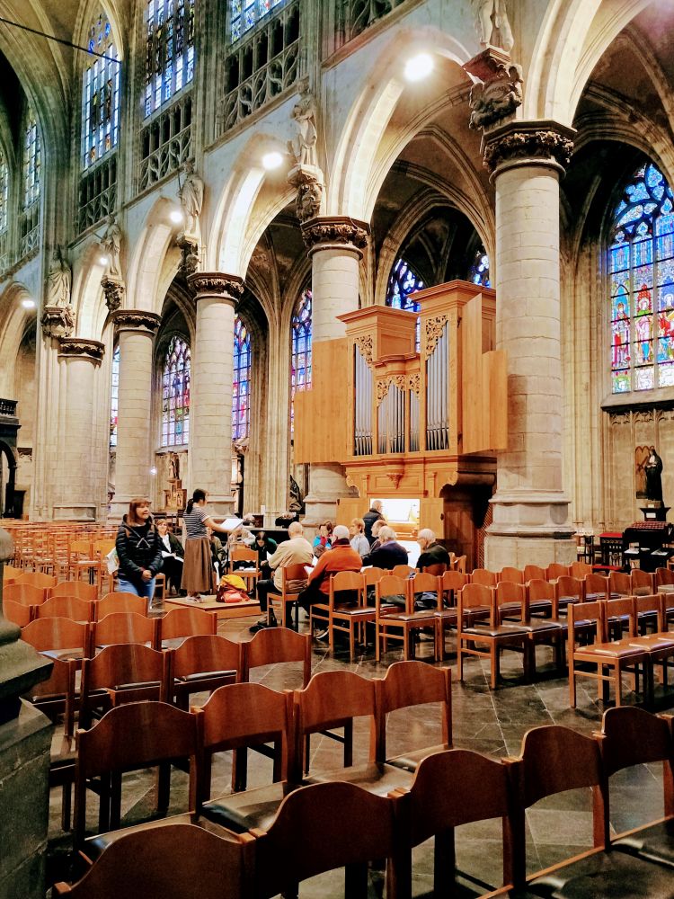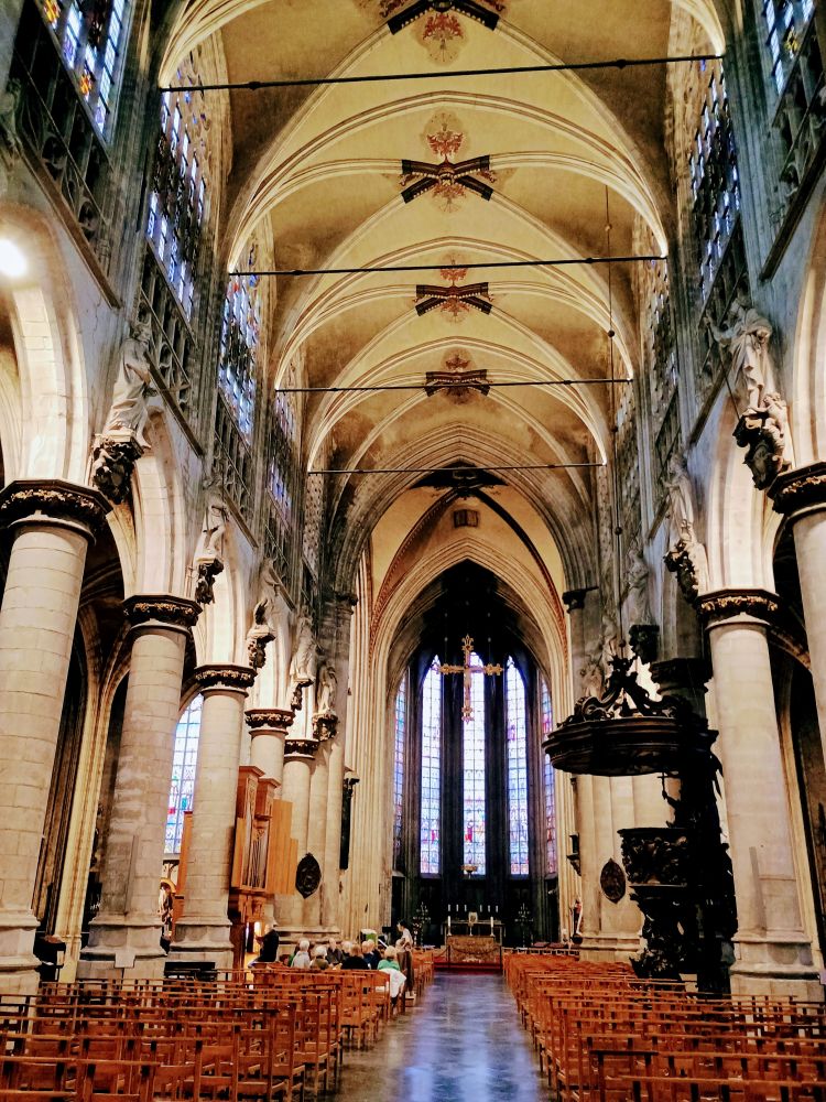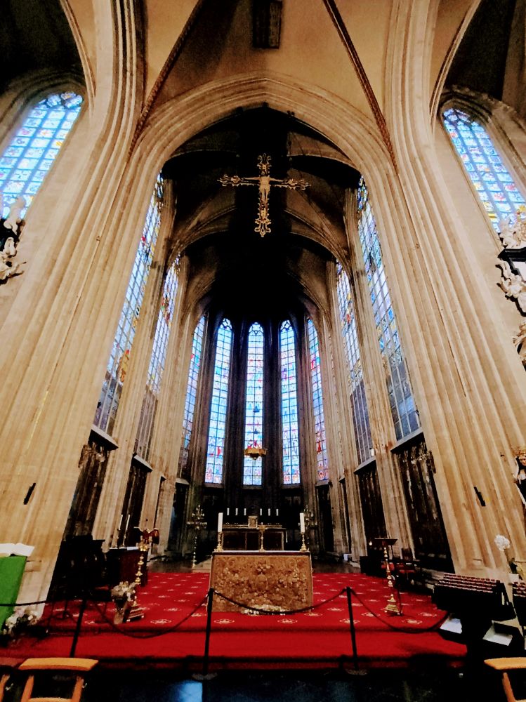 从小广场步行十分钟,就到了圣弥额尔与圣古都勒主教座堂。这座哥特式大教堂始建于13世纪,历时近300年才竣工,是布鲁塞尔最重要的宗教建筑之一。教堂内部拥有精美的彩绘玻璃窗、巴洛克风格的讲道坛与哥特式柱廊。1962年起成为天主教布鲁塞尔教区的主教座堂,常用于国家级宗教仪式,包括王室婚礼和国葬。这座教堂还因其高达64米的对称双塔,被称为“布鲁塞尔的巴黎圣母院”。