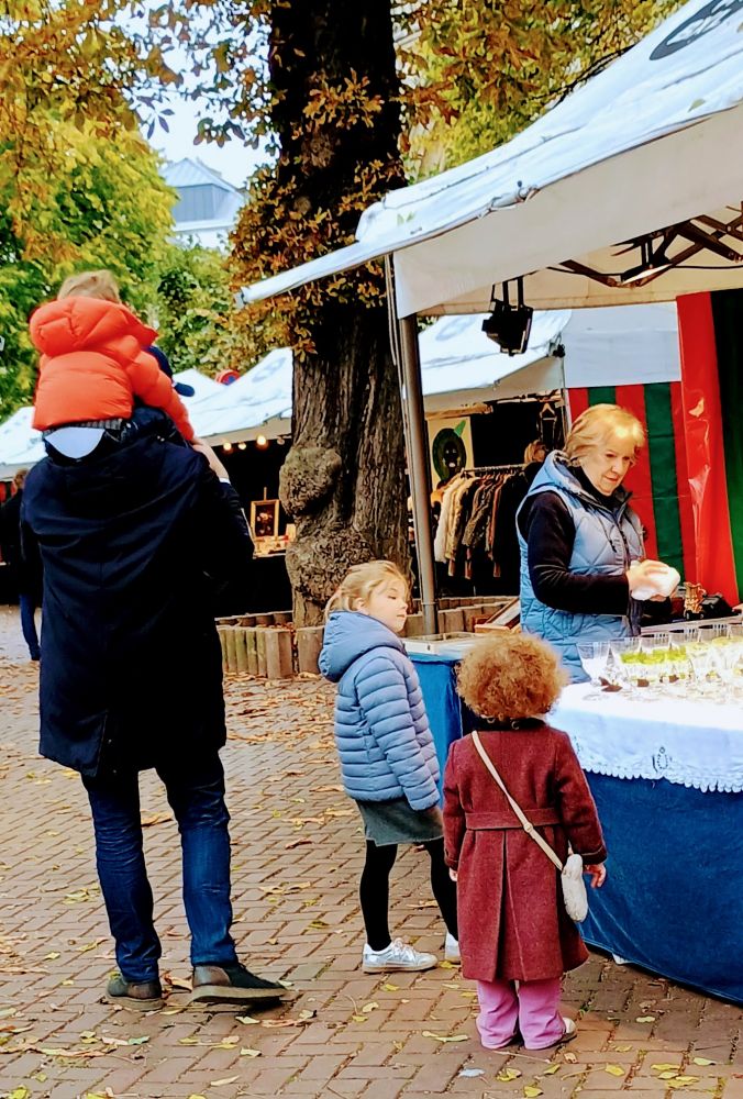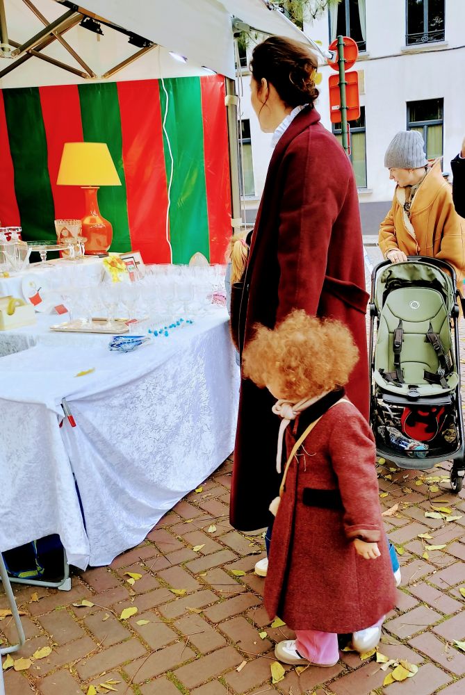 听到孩子稚嫩的说笑声,原来是一家五口来逛古董市场了(见下图,父亲与三娃,母亲与小女儿)。卷发小女孩(她的头发太好玩了)一下子吸引了我的注意力,她的大衣是复古版吧?跟她妈妈的同样款式,还斜背着小皮包,颇有小淑女模样,跟穿着羽绒服的小姐姐像是来自两个年代。