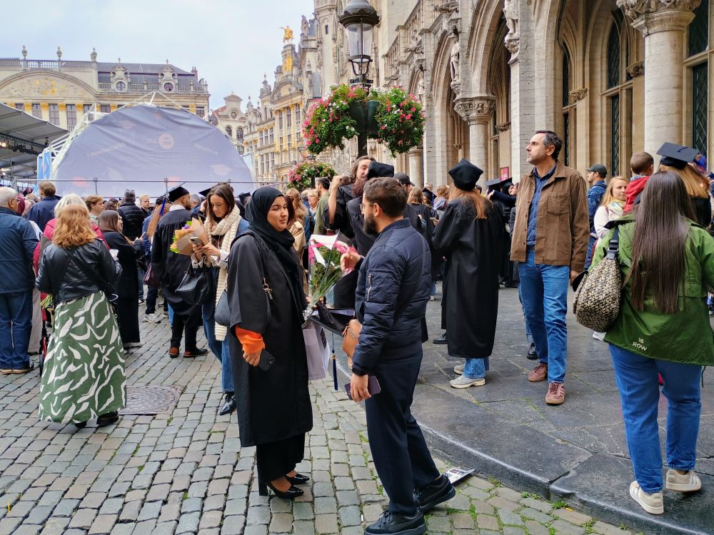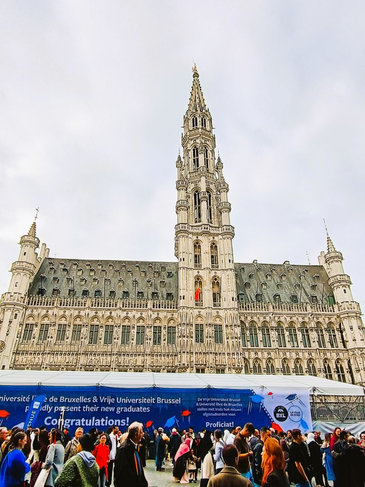 到了大广场,人山人海,人声鼎沸,市政厅前搭起了巨大的帐篷和坐席,那天,布鲁塞尔自由大学在市政厅前举行毕业典礼。广场上除了为数众多的游客外,又多了成千上万毕业生的亲友。到处是一大家子,男女老少,手捧鲜花,眉开眼笑,跟身穿学位服的毕业生们热烈拥抱。