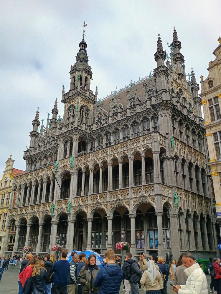 越过黑压压一片人头,从远处仰望了一下华丽精美的市政厅。市政厅建于15世纪、采用了精致的弗兰德哥特式建筑风格,融合了雕塑、塔楼、雕刻繁复的外墙,来彰显布鲁塞尔的权力、财富、艺术与荣耀。高达96米钟楼的顶部是布鲁塞尔守护神——大天使圣米歇尔的雕像。市政厅的另一特点是其不对称的布局,因为左右两翼是由两位不同的设计大师设计的。