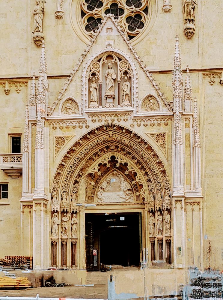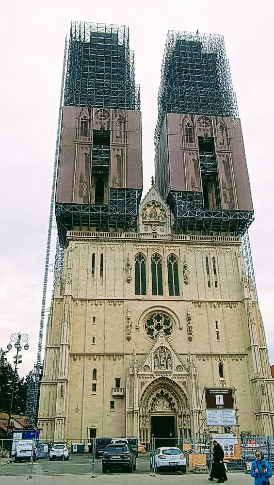 离开菜市场,往山上走两三分钟,便是萨格勒布圣母升天大教堂(Cathedral of Zagreb)。这是克罗地亚最高的宗教建筑,也是萨格勒布的地标。遗憾的是,大教堂正在整修中,不对外开放,教堂门口堆满了建筑材料,教堂的双塔被脚手架围得严严实实。尽管无法进去参观,却从外部见识了这座教堂的宏伟。