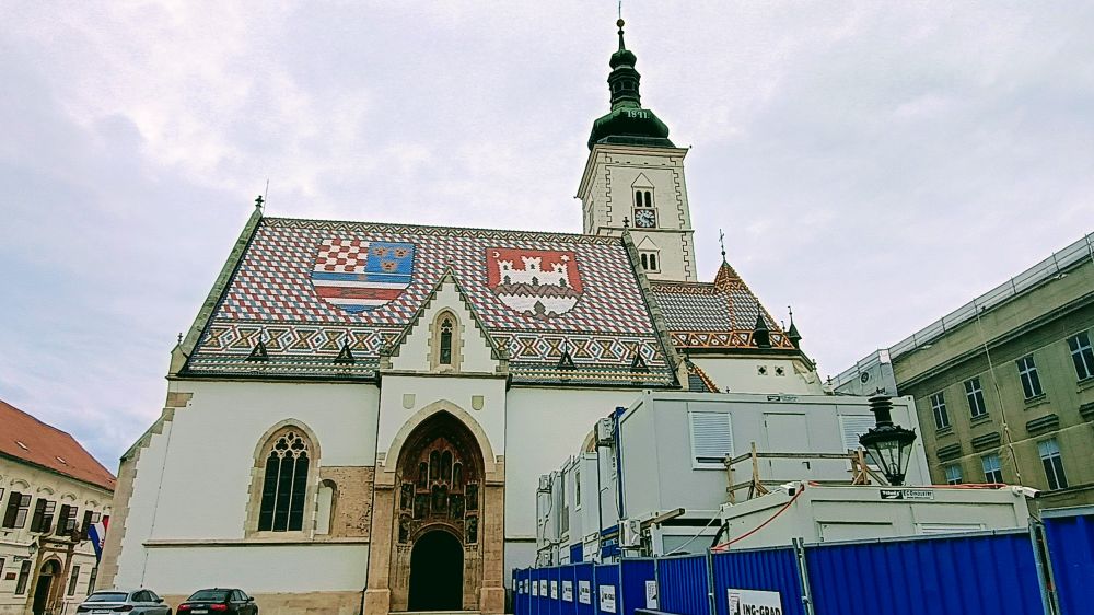 这座教堂同样融合了各种建筑风格:13世纪初建时是罗马风格,14世纪改建为晚期哥特式。1880年地震后,教堂修复时增建了彩色瓷砖屋顶,用2000多块釉面陶瓦拼贴而成。左侧是克罗地亚王国的纹章,右侧是萨格勒布市徽。