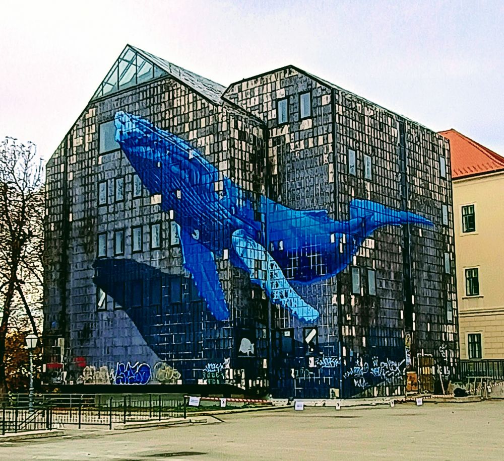 之后,我俩去了斯特罗斯迈耶观景台(Strossmayerovo setaliste),俯瞰萨格勒布市容。附近一座建筑上巨大的蓝鲸壁画也是萨格勒布的一个看点。