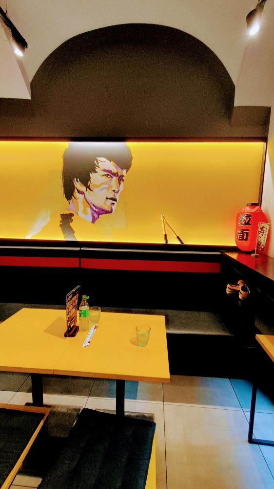 功夫饭店的老板是一位四十来岁壮实的当地人,穿红厨师服,戴黑色的厨师高帽子,英文说得不错。他抱歉说热汤面已售完,只有炒面了。于是朋友要了新加坡海鲜炒粉,我要了照烧 (Teriyaki) 牛肉盒饭,味道不错。据老板说,餐馆只有两个人,中国厨师负责厨房,老板负责店堂。大约为了“功夫”二字,墙上画着李小龙。