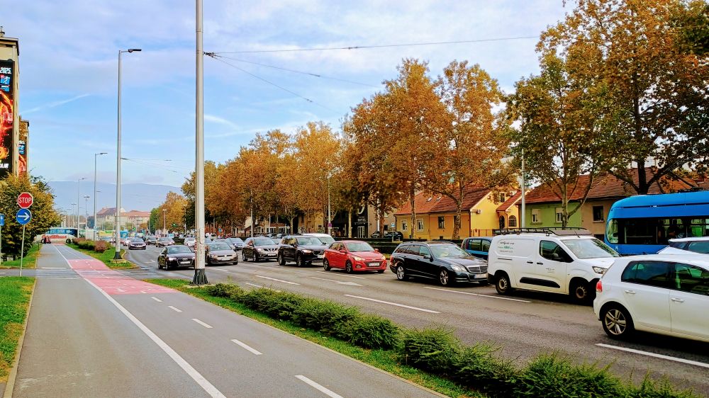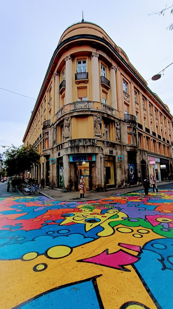 由于次日一早我们将再次搭乘Flixbus去塞尔维亚的首都贝尔格莱德,因此找了一家离客车总站较近的旅店,沿着车站前的大马路走10分钟就到了。这条大马路的中间是有轨电车轨道,两边各有4条车道、人行道和自行车道,宽度跟硅谷的高速公路不相上下,两侧有许多树木和方方正正、相貌单调的水泥建筑。这类“宏大叙事”手法是典型的东欧社会主义国家风格吧。大路上虽然车不少,但行人寥寥无几。