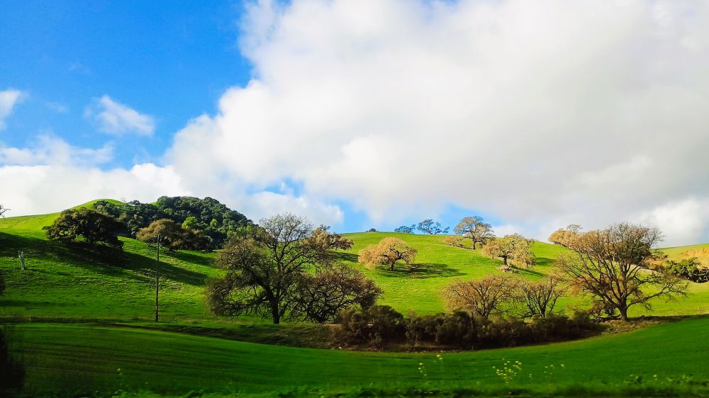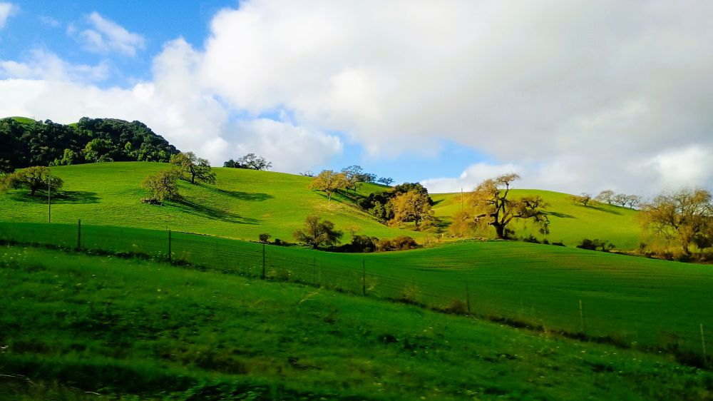 尽管今天阴雨连绵,但过两天又是晴天了。下图是前两天在加州高速公路上随拍的小山坡,绿茵茵的,充满生机,哪像冬天啊。