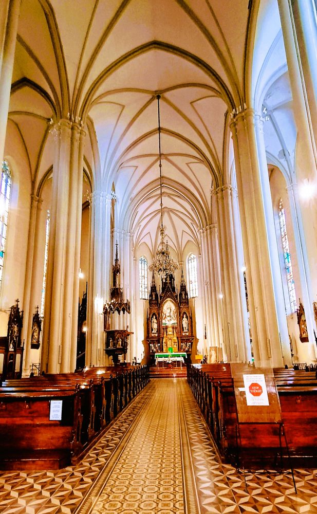 位于广场的另一著名建筑是圣母之名教堂(Name of Mary Church),这座新哥特式的天主教堂,建于19世纪末,尖塔高达72米,是诺维萨德最高的教堂建筑。与其雄伟华丽的外表相比,教堂内部相当“简朴”(见下图)。
