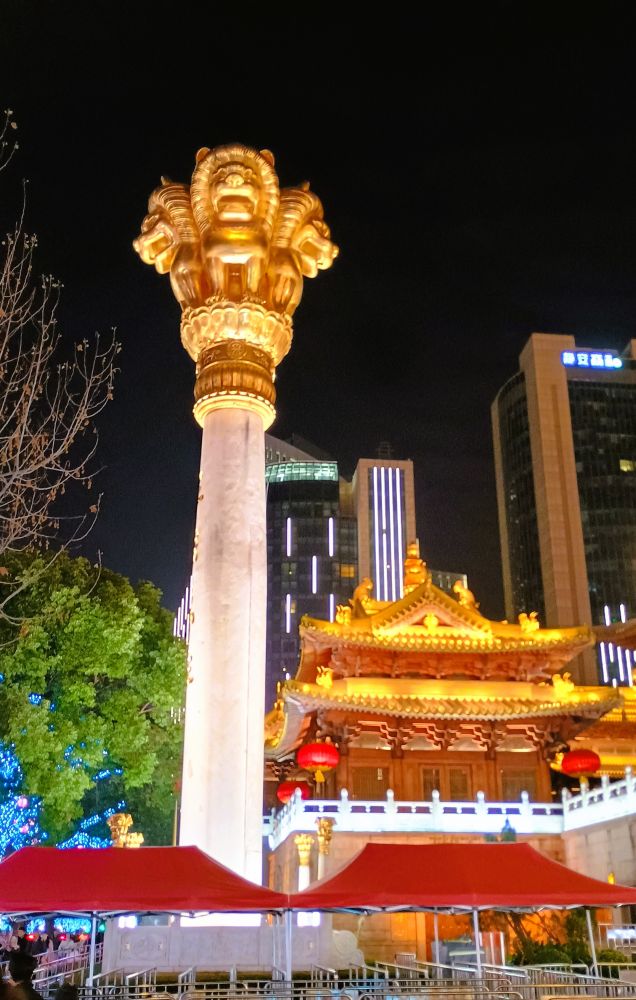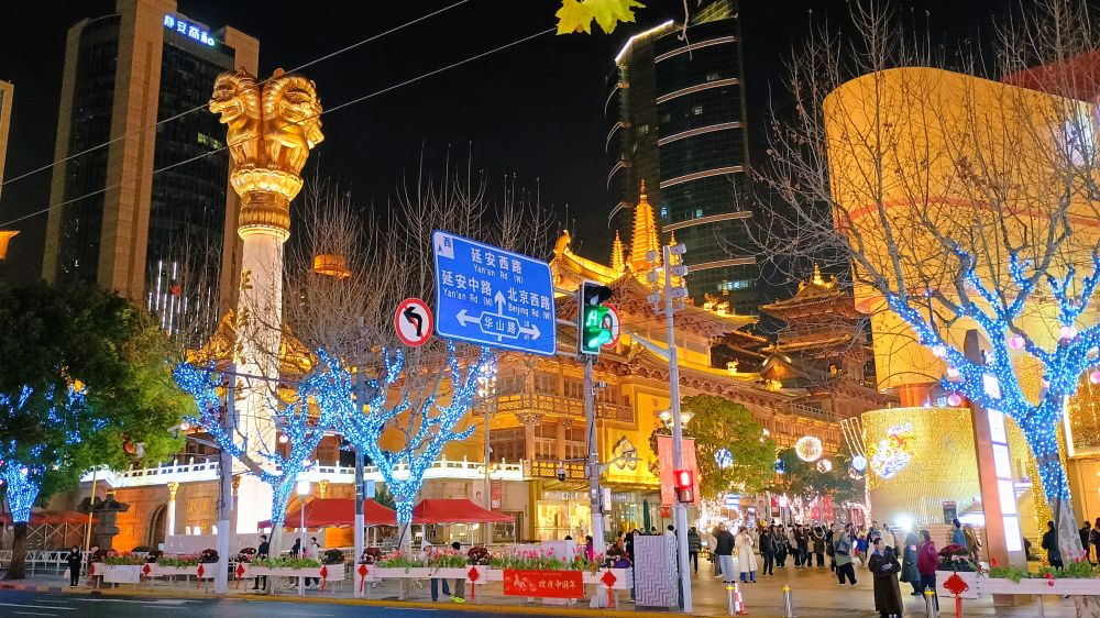 看看静安寺附近的夜景吧,这是初四晚上。下图摄于久光百货公司旁边的小广场、位于南京西路的静安寺、以及嘉里中心前的小广场。