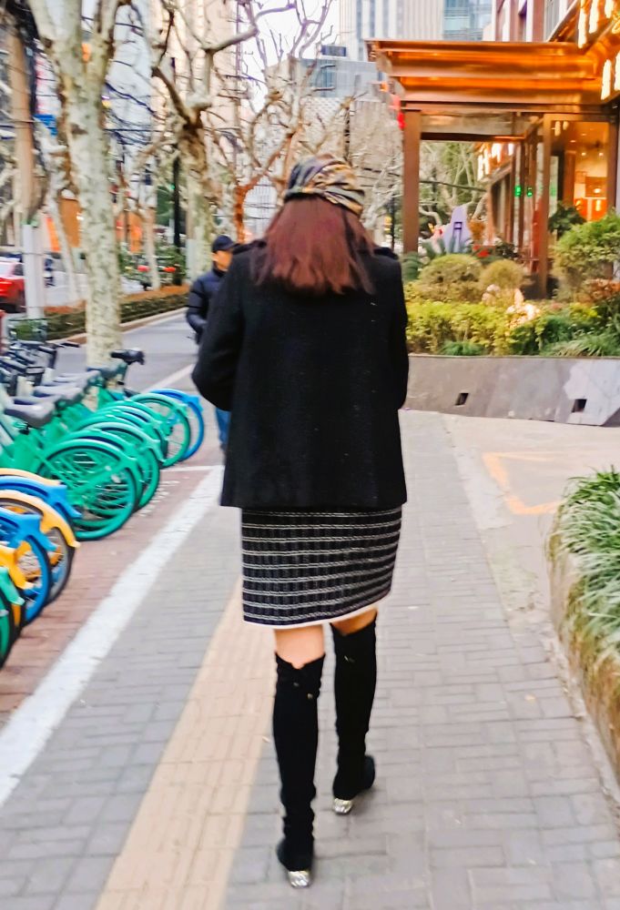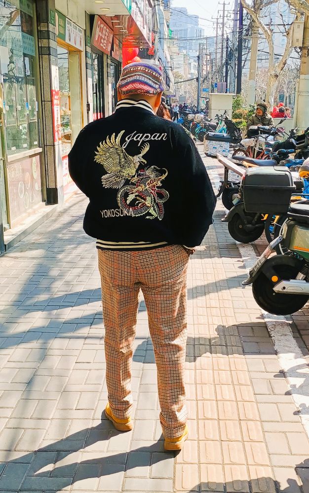 下图中这二位“时髦”行人,摄于一条市井味浓郁的街道,前者是弄堂里的上海爷叔。我把照片给朋友看,爷叔的打扮被喻为“阿污冒充金刚钻”。言下之意是,爷叔要冒充上海老克勒,可惜审美品位太成问题了。
