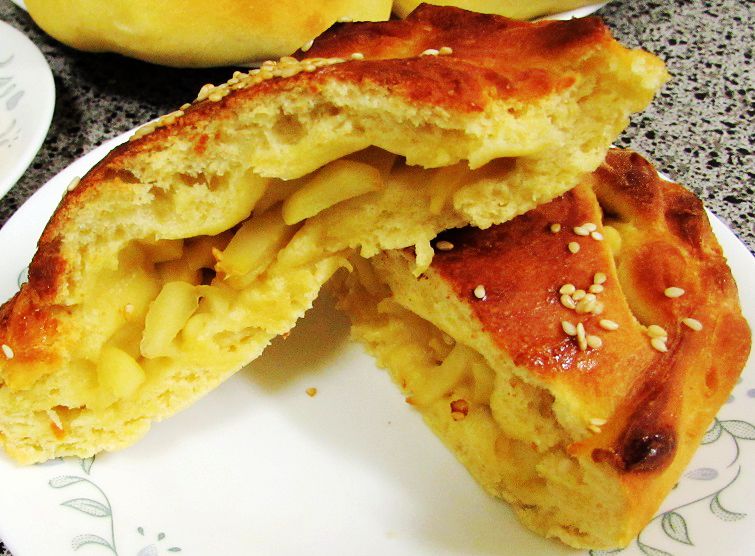 做法: 南瓜洗净去瓤后切长条,和洗净的紫薯一块放蒸锅大汽蒸十八粉钟,取出后把紫薯皮剥掉放一大碗捣成泥,然后盖好放冰箱备用。南瓜剥皮后放面上,取一小碗加四汤匙水,然后放红糖和酵母粉化开,边和面边慢慢均匀撒在面上。不需要太多水,蒸好的南瓜出水足够了。尽量把面和透,到软硬适中不粘手,表面平滑为好,然后等其发起。苹果洗净削皮去核后切小碎块。面发好后取一面板,撒上一汤匙面粉再柔透一次,然后按面板大小把面分几等份,切约两寸半大小的剂子,擀到三毫米厚,在一片上放苹果或紫薯馅,再盖另一块面皮,四周捏紧再卷起花纹,省十五到二十分钟。