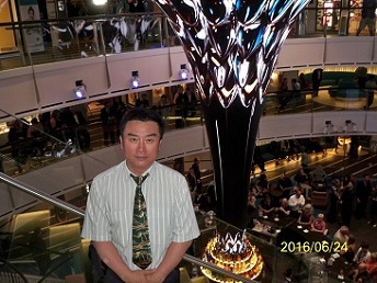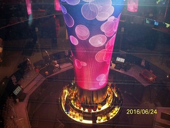 2016年6月24日,我们的游轮全天都在地中海上,由东向西航行。游轮上安排了很多活动项目,以供游客们选择。下图是邮轮的主楼层大厅,喇叭形的中心圆柱有彩色灯光,还时常变换着颜色,充满了欢乐喜庆的气氛。