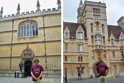 图17. 牛津大学考试学校的大楼(右)和我在大楼前面的留影(左)