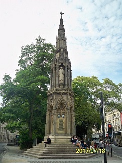原来这里是三位新教牧师殉难的地方。他们是宗教改革的重要成员,在天主教会的淫威下,仍然不肯改变信仰,因此被烧死在这里。后人为了纪念他们,在此地建立了这座哥特式的尖塔型纪念碑。在纪念碑的中层部分,有他们三个人的立像。