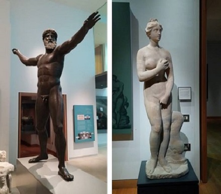 图40. 牛津大学博物馆里的宙斯掷标枪青铜雕像(左)和阿芙洛戴特的大理石雕像(右)
