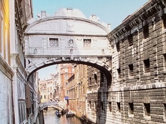 下图是意大利威尼斯的“叹息桥”,桥的一边是法院,另一边是监狱。犯人在法院判决后去监狱服刑,经过此桥时,总是 “叹息”一声,因此而得名。我去年曾经到过那里。