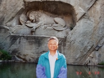 2002年6月30日上午8点半,我们开始了卢塞恩市区游。首先到狮子广场附近的冰川公园,公园中有一座垂死的狮子石像,刻画一只受伤的狮子,用以纪念法国大革命时,在巴黎牺牲的850名瑞士雇佣兵。下图是我在狮子纪念碑前面的留影。