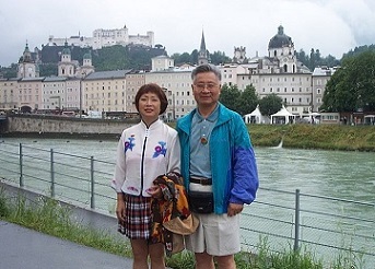 2002年6月28日上午8点,我们的旅游大巴离开克拉根福,开往萨尔茨堡。三个小时后到达萨尔茨堡。旅游大巴停在萨尔茨堡河边让我们漫步游览。下图是我与我妻在河边的合影,背景是萨尔茨堡的市中心。