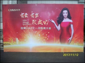 下图是“德信度假酒店”和“玉果楼”之间的广告牌,广告牌上登载着上次会议的广告,广告上是影视明星李冰冰的大幅照片。