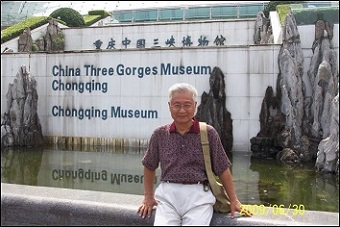 下图是我在三峡博物馆里的留影,再下图是我妻在三峡博物馆内民族服装展厅前面的留影,第三图是我与我妻在重庆中国三峡博物馆外面小花园里的留影。