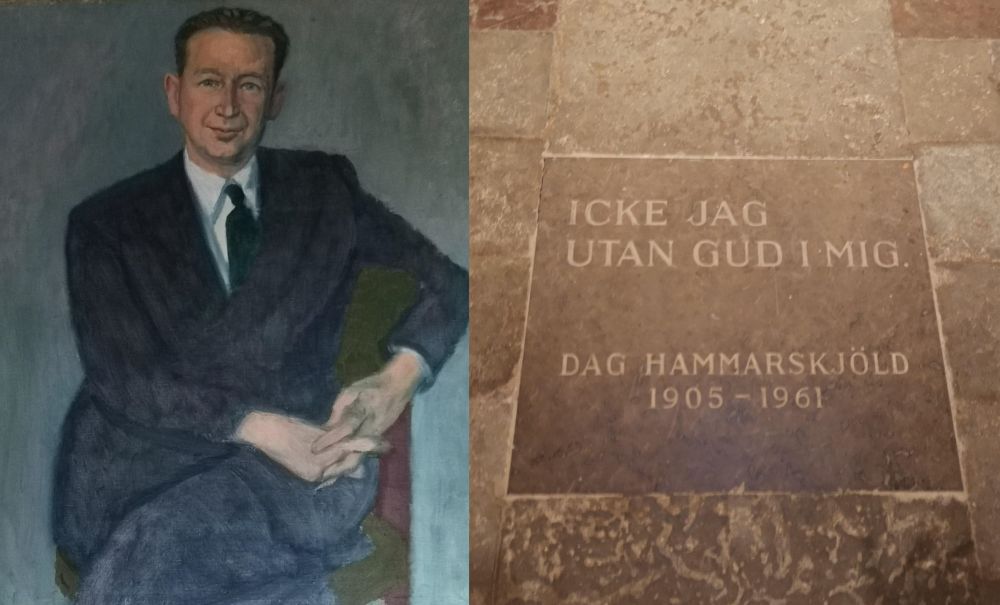 达格·哈马舍尔德 (Dag Hammarskjöld,1905-1961) 是瑞典著名外交家和政治家,从 1953年起出任第二任联合国秘书长,直到1961年9月18日在前往非洲的停火谈判中坠机身亡。哈马舍尔德在担任联合国秘书长期间,为世界和平事业倾尽毕生精力,被认为是20世纪最伟大的政治家之一。他生前获得11人的诺贝尔和平奖提名,身后被追授为1961年和平奖得主。他是唯一在任内殉职的联合国秘书长,也是唯一被追授的诺贝尔和平奖得主,迄今整整60年。左图为斯京贵族院中哈马舍尔德的画像,右图是雕刻在 Uppsala大教堂地砖上的他的名言:“不是我,而是神在吾心”。