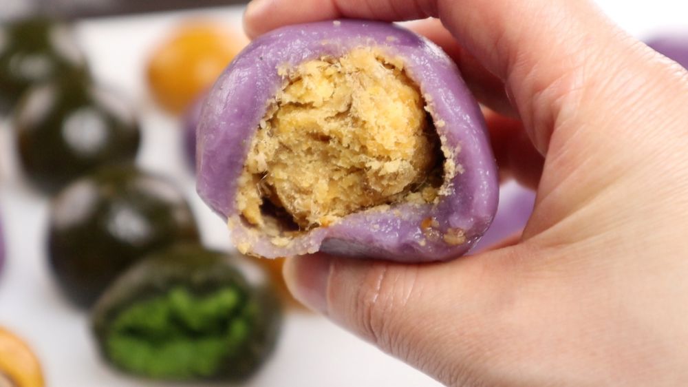 视频中包括了怎么用冷冻脱水的办法来制作干干的豌豆泥, 然后稍许炒制即可成馅。