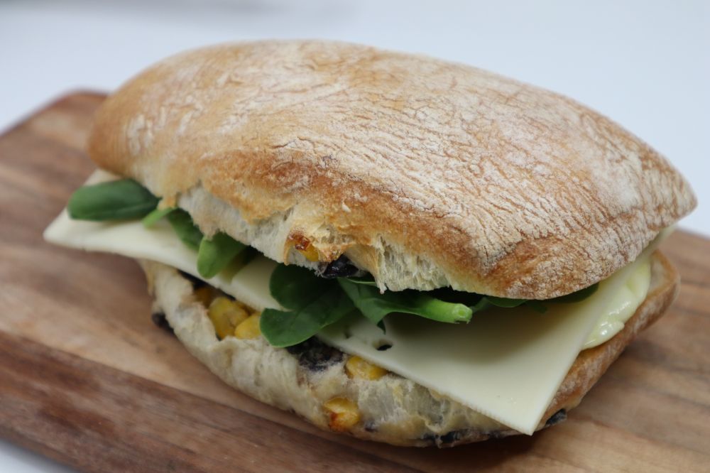 夏巴塔面包,我很喜欢吃, 清清爽爽, 加点蔬菜奶酪就是帕尼尼三明治啦。