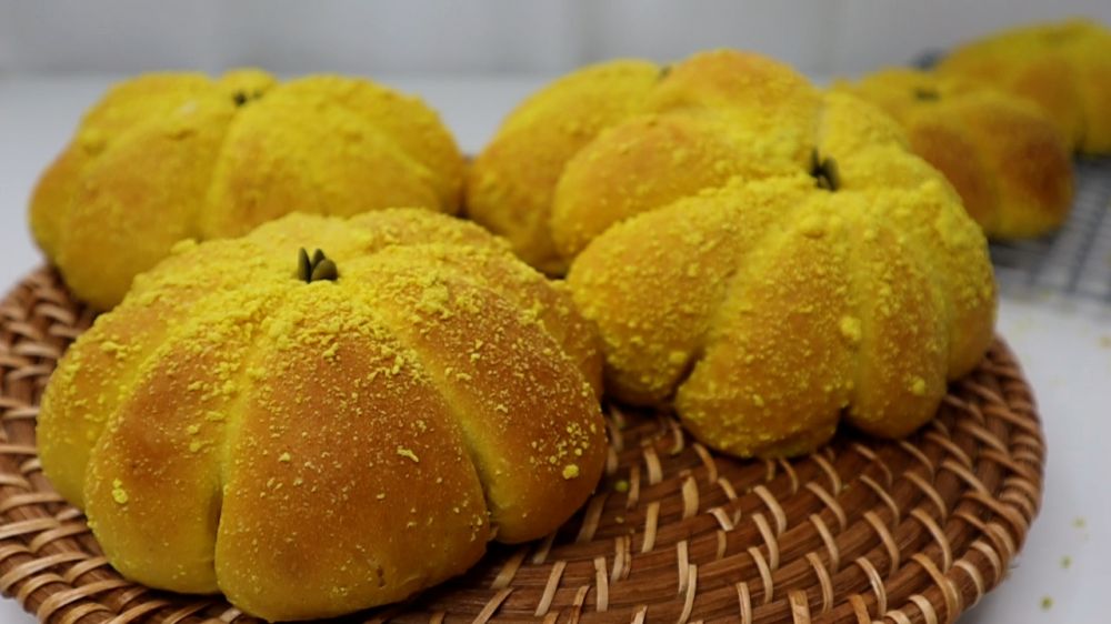 主面团制作 - 高筋面粉 450g - 即发干酵母 4g - 盐4g - 白砂糖60g - 姜黄粉5g - 烫种 50g - 鸡蛋1 pcs (~55g) - 无盐黄油45g - 牛奶 125~135g - 南瓜泥150g *根据南瓜泥稠度来调整牛奶用量